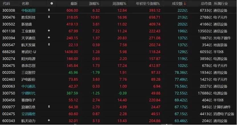 市場共計1308只個股收漲,漲停股54只;4058只個股收跌,跌停股12只。9只個股日成交額超過100億元,CPO概念龍頭股“易中天”再度成為市場最靚的仔,中際旭創(chuàng)(300308)收漲6.32%報606元/股,新易盛(300502)收漲3.61%報419.13元/股,天孚通信(300394)收漲1.37%報240.15元/股。電子元件個股勝宏科技(300476)收漲10.81%報318.05元/股,通信設(shè)備個股工業(yè)富聯(lián)(601138)收漲7.22%報67.99元/股。