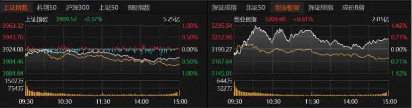 指數(shù)表現(xiàn)分化,滬指收跌0.37%報3909.52點,創(chuàng)業(yè)板指收漲0.61%報3209.6點,深證成指、科創(chuàng)50、滬深300、上證50均微跌,北證50跌近2%。