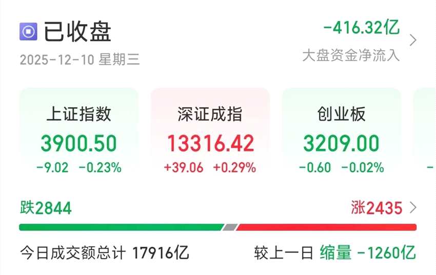 三大指數(shù)漲跌不一。截至收盤(pán),上證指數(shù)跌0.23%,深證成指漲0.29%,創(chuàng)業(yè)板指微跌0.02%,北證50跌0.85%。全市場(chǎng)成交額為1.79萬(wàn)億元,較上一日縮量1260億元。滬深兩市超2400只個(gè)股股價(jià)上漲。