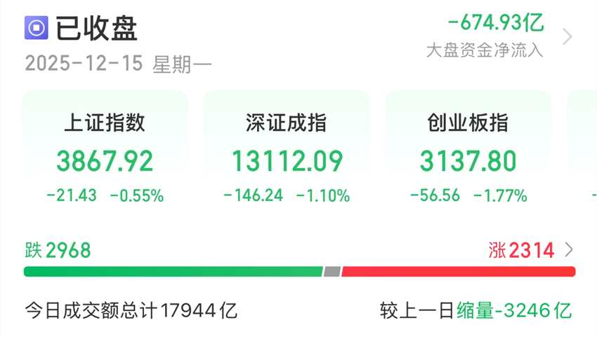 截至收盤(pán),上證指數(shù)跌0.55%,深證成指跌1.1%,創(chuàng)業(yè)板指跌1.77%,北證50跌1.09%。全市場(chǎng)成交額1.79萬(wàn)億元,較上日成交額縮量3246億元。