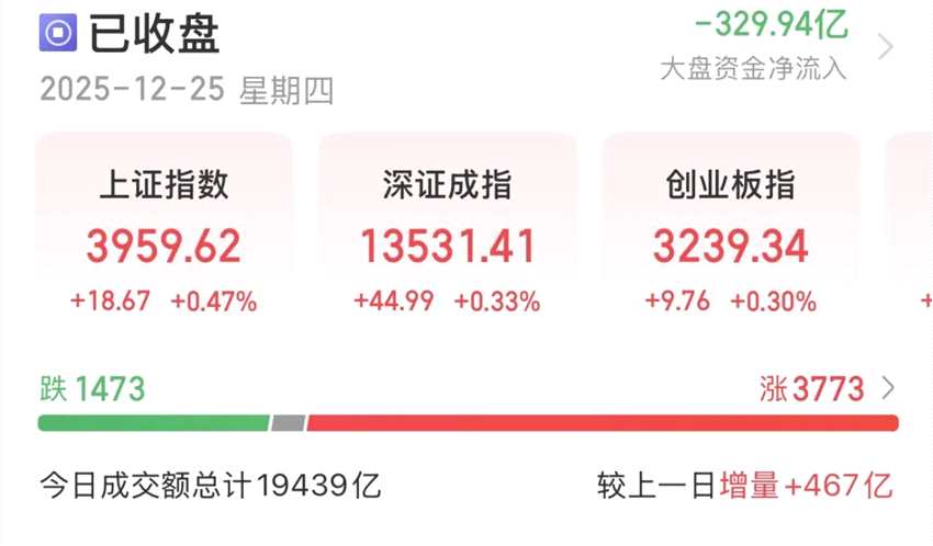 隔夜美股喜氣洋洋,12月25日,A股也量價溫和齊升,滬指七連陽,日成交額增至1.94萬億元,3773只個股收漲,航天板塊表現(xiàn)亮眼。