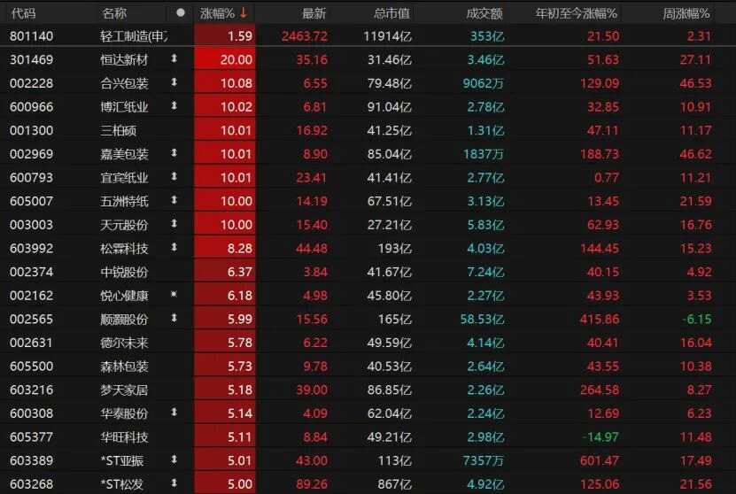 10只輕工制造個股漲停,恒達新材(301469)“20cm”漲停,合興包裝(002228)、博匯紙業(yè)(600966)、三柏碩(001300)、嘉美包裝(002969)、宜賓紙業(yè)(600793)、五洲特紙(605007)、天元股份(003003)均漲停。
