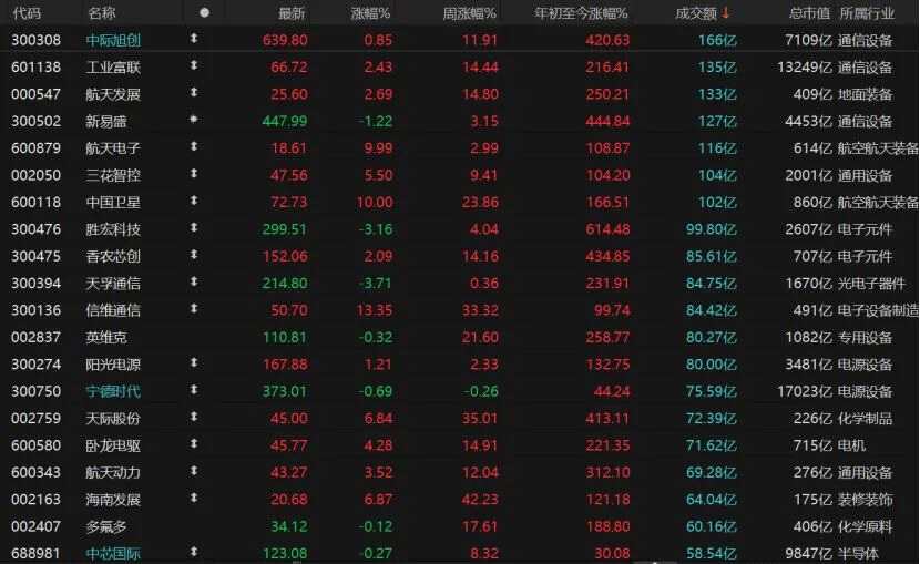 個股漲多跌少,3773只個股收漲,漲停股93只;1473只個股收跌,跌停股2只??萍脊少Y金交易量靠前,7只個股日成交額超過100億元,中際旭創(chuàng)(300308)收漲0.85%報639.8元/股,工業(yè)富聯(lián)(601138)收漲2.43%報66.72元/股,航天發(fā)展(000547)收漲2.69%報25.6元/股,新易盛(300502)收跌1.22%報447.99元/股。航天電子(600879)、中國衛(wèi)星(600118)漲停。