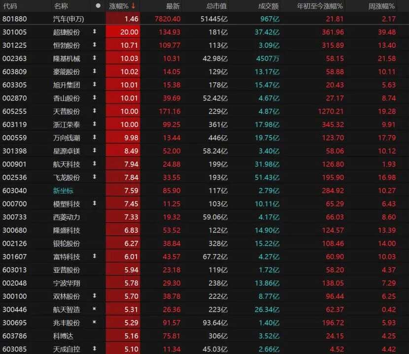 9只汽車股漲停,超捷股份(301005)“20cm”漲停,隆基機械(002363)、豪能股份(603809)、旭升集團(603305)、香山股份(002870)、天普股份(605255)均漲停。