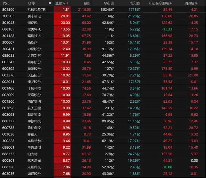 14只機械設(shè)備個股漲停,昊志機電(300503)、綠島風(fēng)(301043)“20cm”漲停,泰爾股份(002347)、龍溪股份(600592)、大業(yè)股份(603278)、鋒龍股份(002931)、江順科技(001400)、天奇股份(002009)、南礦集團(001360)、航天工程(603698)均漲停。