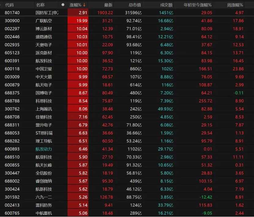 國防軍工概念領(lǐng)漲,掀起漲停潮。博云新材(002297)、盛路通信(002446)、天奧電子(002935)、派克新材(605123)等10只相關(guān)個股漲停,廣聯(lián)航空(300900)“20cm”漲停。