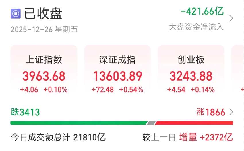 12月26日,A股三大指數開盤漲跌不一,臨近午間盤中一度集體翻綠,午后全部翻紅。截至收盤,上證指數漲0.1%報3963.68點,深證成指漲0.54%報13603.89點,創(chuàng)業(yè)板指漲0.14%報3243.88點,北證50漲0.35%報1463.04點。全市場成交21810億元,較上一日增量2372億元。