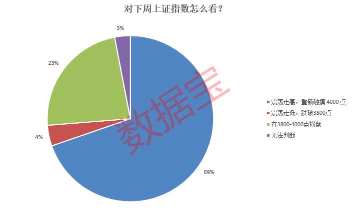 A股持續(xù)震蕩走高,投資者信心回升,對(duì)于下周市場(chǎng)看漲的人數(shù)占比大幅提高。數(shù)據(jù)顯示,69%的投資者認(rèn)為下周市場(chǎng)將“震蕩走高,重新觸摸4000點(diǎn)”;23%的投資者認(rèn)為市場(chǎng)將“在3800—4000點(diǎn)橫盤”,僅有4%的投資者明確看空市場(chǎng)。