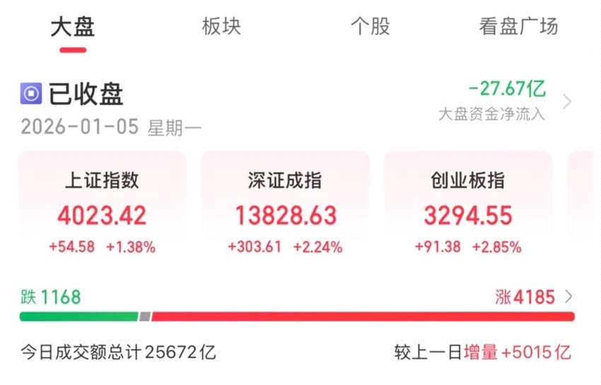 1月5日收盤,滬指漲1.38%收復(fù)4000點(diǎn),走出12連陽(yáng);深證成指漲2.24%,創(chuàng)業(yè)板指漲2.85%,北證50指數(shù)漲1.80%。滬深北三市成交25672億元,較上個(gè)交易日放量5015億元。全市場(chǎng)超4100只個(gè)股上漲,超120股漲停。