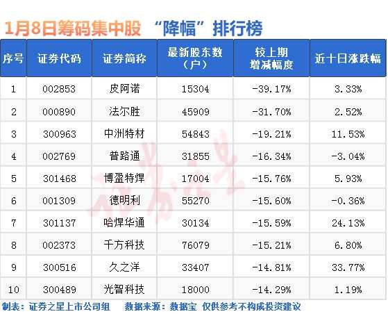 除了ST股外,股東戶數(shù)降幅最多的是皮阿諾,截至12月31日最新股東戶數(shù)為15304戶,較12月20日下降39.17%;其次是法爾勝,截至12月31日最新股東戶數(shù)為45909戶,較12月20日下降31.70%。