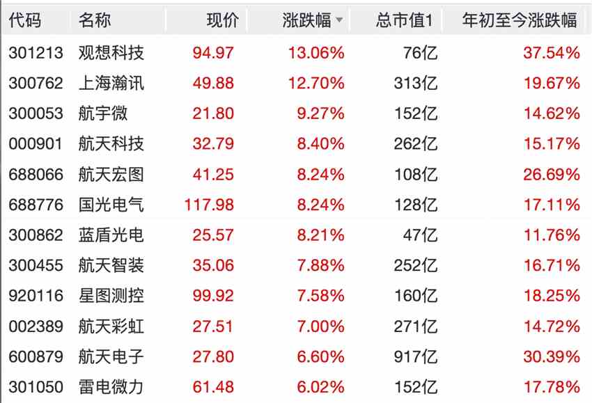 個(gè)股方面,觀想科技(301213)漲超13%,上海瀚訊(300762)大漲超12%,航天電子(600879)、中國(guó)衛(wèi)星(600118)、金風(fēng)科技(002202)、航天智裝(300455)、星圖測(cè)控、航宇微(300053)、航天宏圖、雷電微力(301050)、航天彩虹(002389)、藍(lán)盾光電(300862)等漲幅居前。