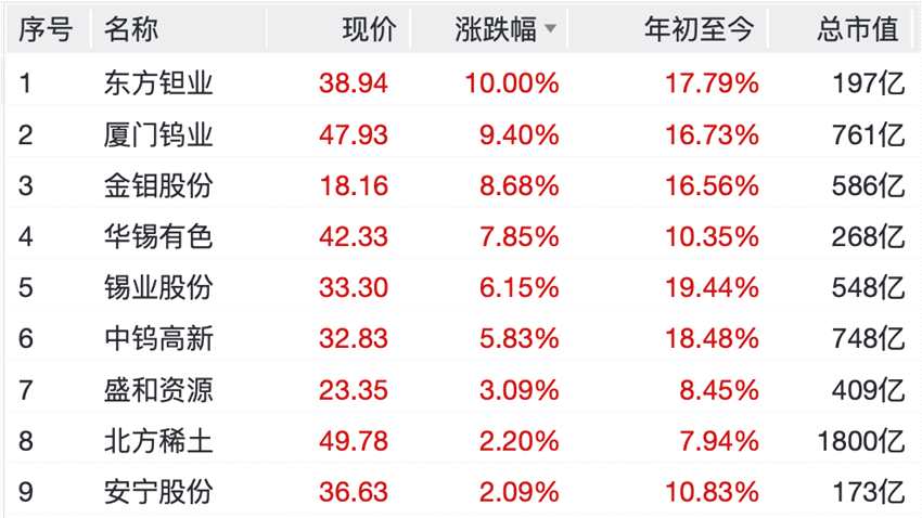 東方鉭業(yè)(000962)錄得10cm漲停,金鉬股份(601958)、華錫有色(600301)、中鎢高新(000657)漲超6%,錫業(yè)股份(000960)、盛和資源(600392)、北方稀土(600111)等紛紛上漲。