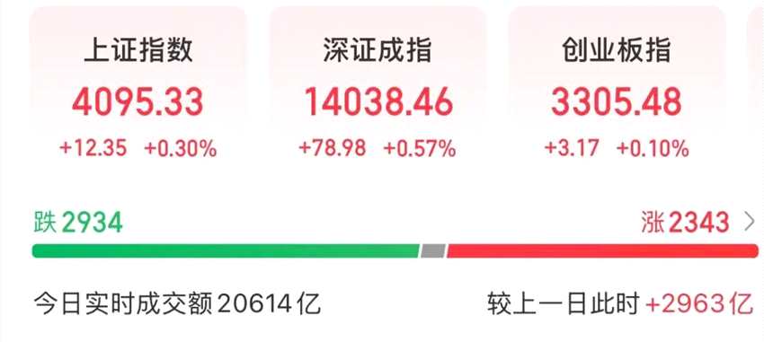 今天上午,A股三大股指齊漲。截至上午收盤,上證指數(shù)上漲0.3%,深證成指上漲0.57%,創(chuàng)業(yè)板指上漲0.1%。上午,市場大幅放量,成交額為20614億元,較昨日上午增加2963億元。