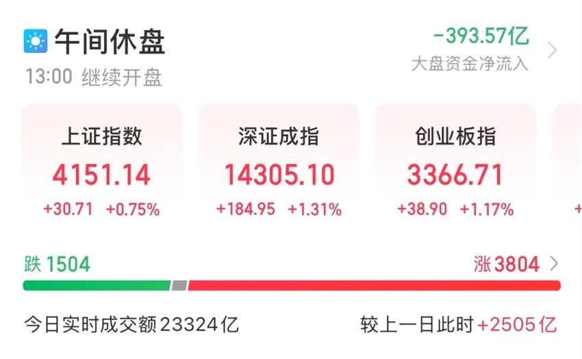 1月12日早盤,A股主要指數(shù)集體上漲。截至午間收盤,上證指數(shù)漲0.75%,深證成指漲1.31%,創(chuàng)業(yè)板指漲1.17%,科創(chuàng)綜指漲2.46%,北證50指數(shù)漲4.20%。滬深北三市半日成交額再度突破2萬億元,達23324億元。