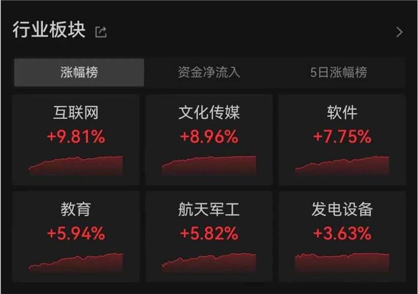 行業(yè)板塊來看,AI(人工智能)應用概念爆發(fā),萬得互聯(lián)網(wǎng)指數(shù)、軟件指數(shù)分別上漲9.81%、7.75%,天潤科技、眾誠科技等超20只個股漲停。