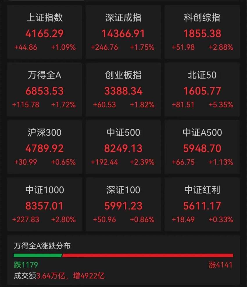 1月12日,A股市場在跨年行情中延續(xù)震蕩上行。截至當日收盤,上證指數(shù)、深證成指、創(chuàng)業(yè)板指分別上漲1.09%、1.75%、1.82%;科創(chuàng)綜指、北證50亦表現(xiàn)強勢,分別收漲2.88%、5.35%。全市場4100余只個股上漲。A股全天成交3.64萬億元,連續(xù)第二個交易日突破3萬億元,刷新此前在2024年10月8日創(chuàng)下的成交額歷史紀錄。