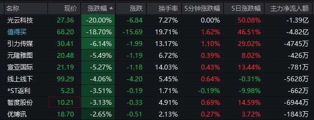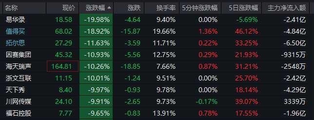 AI應(yīng)用方面,光云科技20%跌停,值得買(300785)20%跌停后開板,易華錄(300212)19.98%跌停,拓爾思(300229)、海天瑞聲、因賽集團(tuán)(300781)、藍(lán)色光標(biāo)(300058)等跌超10%,浙文互聯(lián)(600986)、天下秀(600556)等跌停。