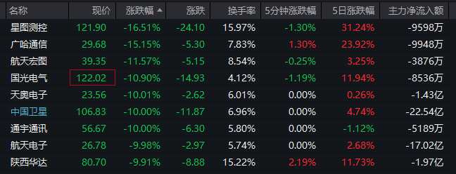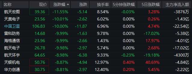 熱點(diǎn)方面,多只商業(yè)航天概念股大幅下跌,廣哈通信(300711)、星圖測控、陜西華達(dá)(301517)、航天宏圖、國光電氣等跌超10%,天奧電子(002935)、中國衛(wèi)星(600118)、通宇通訊(002792)、航天電子(600879)、雷科防務(wù)(002413)、海格通信(002465)、長江通信(600345)等跌停。