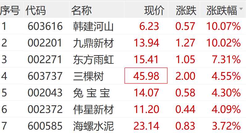 建筑材料概念跟漲,韓建河山(603616)、九鼎新材(002201)漲停,東方雨虹(002271)漲超7%。