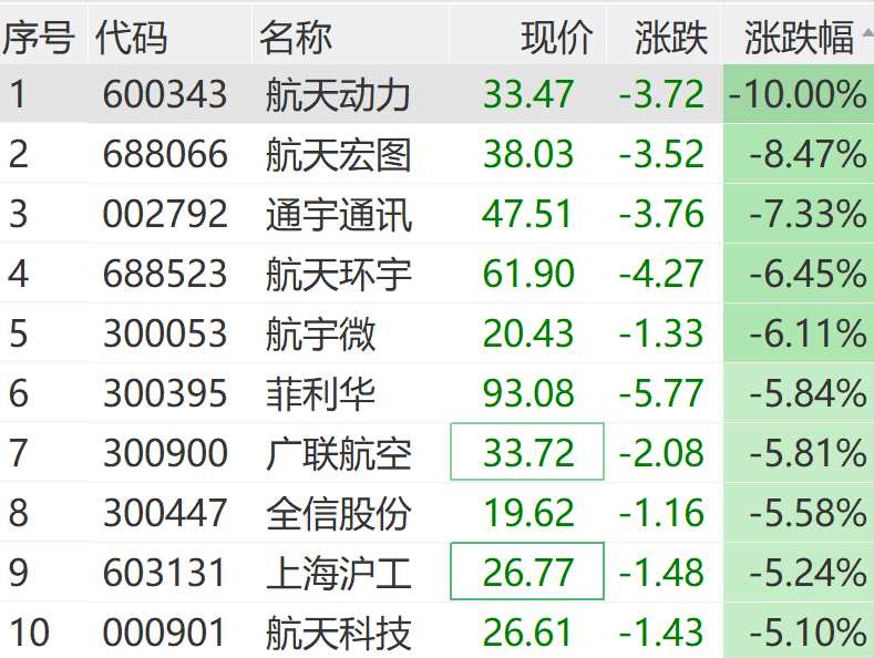 商業(yè)航天概念股繼續(xù)回調(diào),航天動(dòng)力(600343)跳水跌停,航天環(huán)宇、航天宏圖、航宇微(300053)等多股走低。