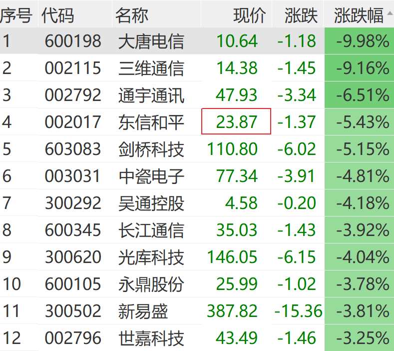 1月20日上午,通信板塊震蕩走低。大唐電信(600198)盤中觸及跌停,三維通信(002115)、東信和平(002017)、劍橋科技(603083)等多股大跌。