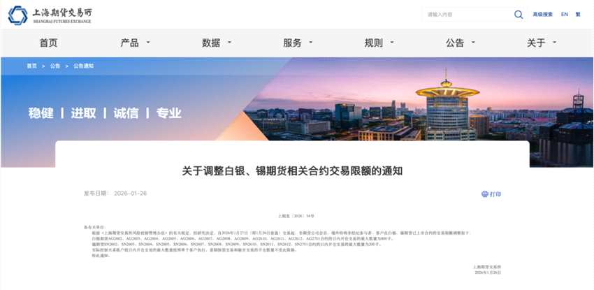 1月26日,上海期貨交易所(以下簡稱“上期所”)再次調(diào)整白銀、錫和銅等期貨品種相關(guān)合約交易限額、保證金比例和漲跌停板幅度,且對部分客戶采取限制開倉等監(jiān)管措施。