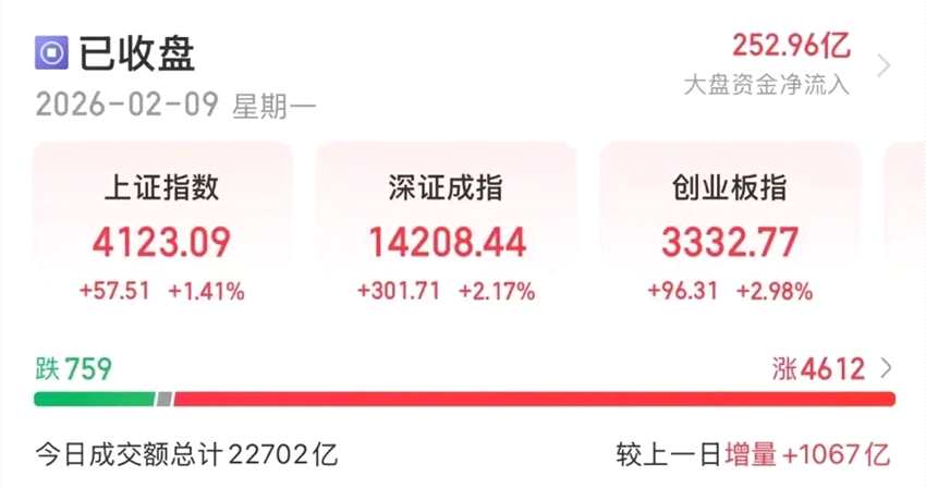 摘要: 本周一A股強勢拉升,截至收盤,上證綜指漲1.41%(重回4100點上方),深證成指漲2.17%,創(chuàng)業(yè)板指漲2.98%,科創(chuàng)50指數(shù)漲2.51%。滬深北三市合計成交約2.27萬億元,