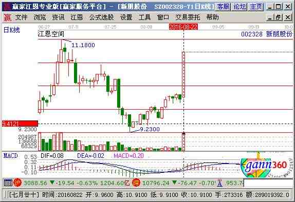 002328股票分析綜合評論:新朋股份002328當(dāng)前趨勢運(yùn)行在生命線以上強(qiáng)勢可操作區(qū)域,中期資金籌碼占流通盤19.32%,主力控盤度較低未來上漲的潛力有待觀察。通過江恩價格工具分析,該股短期支撐是9.82元,阻力是10.91元;通過江恩時間工具分析,該股短期時間窗為 2016-07-18號和2016-08-08號,中期時間窗2016-08-29號和2016-10-02號 ,結(jié)合持倉成本做好計劃。