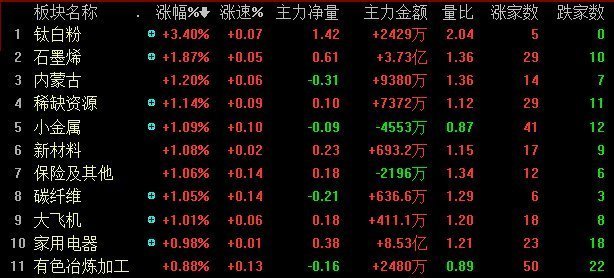 上午收盤前的跳水直接導(dǎo)致了今天各個(gè)板塊的漲幅縮窄,午后的反彈勉強(qiáng)使得板塊漲幅榜尚可。鈦白粉由于標(biāo)的股較少,大漲3%,領(lǐng)漲今天的板塊漲幅榜;石墨烯板塊上漲近2%,雖然沒有領(lǐng)漲,但其板塊內(nèi)的概念股表現(xiàn)最強(qiáng);內(nèi)蒙古、小金屬、新材料、保險(xiǎn)、大飛機(jī)板塊均上漲1%以上,家用電器、有色等板塊亦有不錯(cuò)表現(xiàn)。