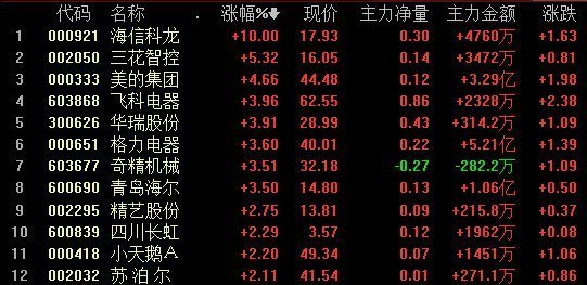 今天市場午后的這一波反彈行情,不得不提家電板塊,可以說是反彈的絕對主力。海信科龍尾盤強(qiáng)勢漲停,三花智控大漲5%,美的集團(tuán)、飛科電器、華瑞股份、格力電器、奇精機(jī)械、青島海爾等個(gè)股亦有不同程度的上漲。今天家電板塊的明星個(gè)股并不是領(lǐng)漲的海信科龍,而是漲幅只有4%和3%的美的集團(tuán)、格力電器。作為家電行業(yè)領(lǐng)頭羊和藍(lán)籌股中的佼佼者美的和格力,今天股價(jià)雙雙創(chuàng)出歷史新高,這就表明機(jī)構(gòu)資金抱團(tuán)的行動(dòng)還沒有結(jié)束,以藍(lán)籌白馬股為主的行情還將持續(xù)一段時(shí)間。目前已經(jīng)大幅度上漲的傳統(tǒng)藍(lán)籌白馬股已不適合介入,可在其他非常規(guī)藍(lán)籌股行業(yè)中尋找行業(yè)中的藍(lán)籌白馬股。