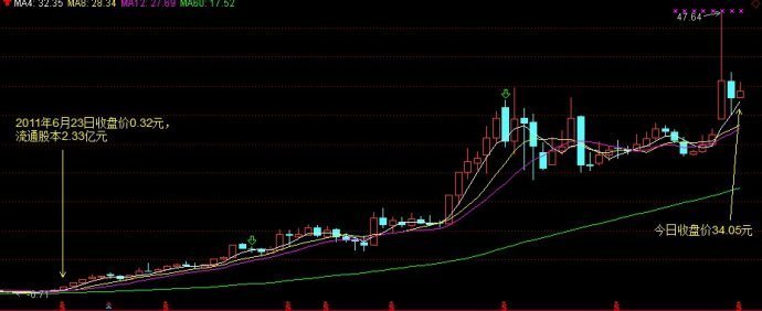 我在這張華夏幸福的月線圖上標示了,2011年6月23日,這只股票的收盤價是0.32元,而時至今日,也就是剛好6年后的今天,股價是34.05元,這兩者股價的相差是106倍。4月12日,華夏幸福創(chuàng)下多年來的最高價也就是47.64元,而這個價位是0.32元的148倍。