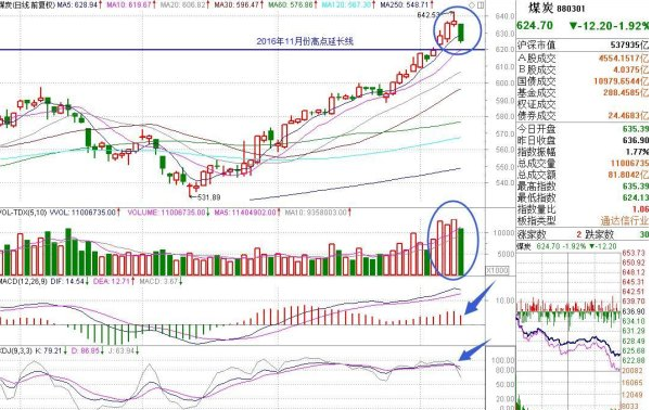 值得注意的是煤炭板塊,今日大幅下挫盤中一度大跌近2%。陜西煤業(yè)、金瑞礦業(yè)、山煤國(guó)際、寶泰隆等個(gè)股大跌超5%,紅陽(yáng)能源、山西焦化等跌幅超4%。雖然受夏季電力需求量增加,煤炭市場(chǎng)迎來(lái)消費(fèi)高峰,價(jià)格保持上行態(tài)勢(shì),致使煤炭板塊個(gè)股近期連續(xù)大漲,但從板塊指數(shù)走勢(shì)上看短期面臨回調(diào)壓力。
