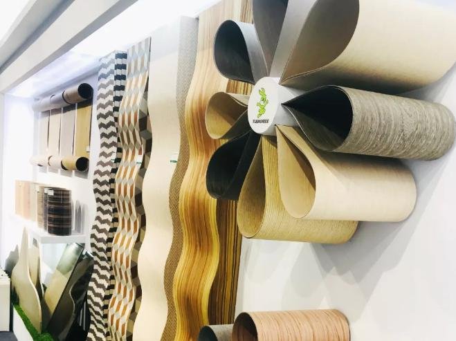 在展會(huì)上,最吸睛的是要數(shù)兔寶寶科技木皮。兔寶寶科技木展樣豐富,有“木卷皮”懸掛方式,有“花形”、“卷筒形”、“波浪形”方式,極富立體感、層次感。多樣的展現(xiàn)形式,不僅能更好的凸顯木皮柔軟、可定制、裝飾負(fù)面尺寸大、易塑形等特點(diǎn),還能將多種紋理、色澤更好的展現(xiàn)。本次展會(huì)中,兔寶寶將展出三十多種科技木產(chǎn)品,其中包含了十幾款新品。將兔寶寶科技木,源于自然,勝于自然展現(xiàn)得淋漓盡致!