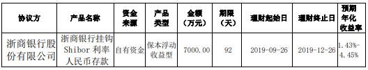 9月27日,浙江仙通(603239)發(fā)公告稱,2019年9月26日,公司與浙商銀行股份有限公司臺(tái)州仙居小微企業(yè)專營(yíng)支行簽署了法人理財(cái)產(chǎn)品相關(guān)協(xié)議: