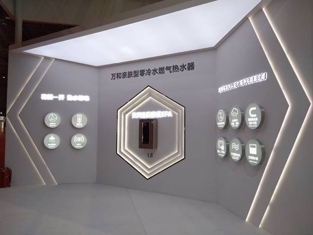 萬和展臺內(nèi),顯著位置是萬和燃熱的明星產(chǎn)品——L8“親膚型零冷水燃?xì)鉄崴鳌薄?/p>
