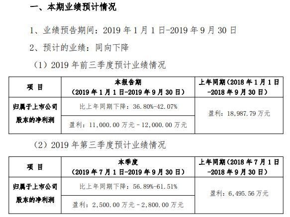 公告顯示,業(yè)績預(yù)告期間:2019年1月1日-2019年9月30日,歸屬于上市公司股東的凈利潤為1.10億元-1.20億元,比上年同期減少36.80%-42.07%。