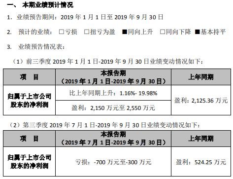 公告顯示,業(yè)績預(yù)告期間:2019年1月1日至2019年9月30日,歸屬于上市公司股東的凈利潤約2,150萬元-2,550萬元,比上年同期上升:1.16%-19.98%。