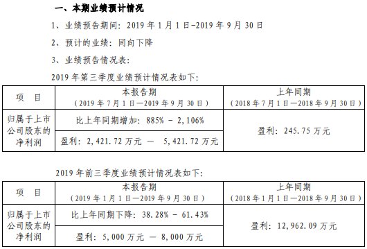 公告顯示,業(yè)績(jī)預(yù)告期間:2019年1月1日至2019年9月30日,歸屬于上市公司股東的凈利潤(rùn)約2,421.72萬(wàn)元—5,421.72萬(wàn)元,比上年同期增加:885%-2,106%。