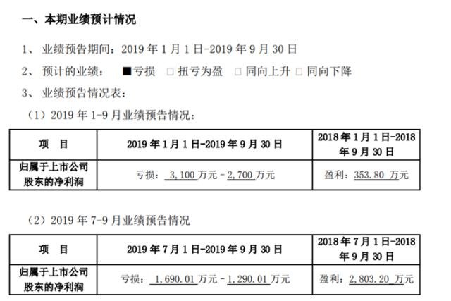 公告顯示,業(yè)績預(yù)告期間:2019年1月1日-2019年9月30日,歸屬于上市公司股東的凈利潤虧損3100萬元–2700萬元,比上年同期盈利353.80萬元。