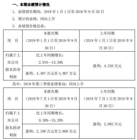 公告顯示,業(yè)績(jī)預(yù)告期間:2019年1月1日至2019年9月30日,歸屬于上市公司股東的凈利潤(rùn)約4,407萬(wàn)元-4,907萬(wàn)元,比上年同期增長(zhǎng):2.01%—13.59%。