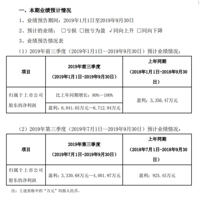 公告顯示,業(yè)績(jī)預(yù)告期間:2019年1月1日-2019年9月30日,歸屬于上市公司股東的凈利潤(rùn)為6041.65萬(wàn)元-6712.94萬(wàn)元,比上年同期增長(zhǎng)80%-100%。