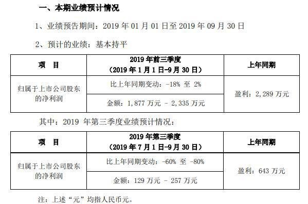 公告顯示,業(yè)績預(yù)告期間:2019年1月1日-2019年9月30日,歸屬于上市公司股東的凈利潤為1877萬元-2335萬元,比上年同期基本持平。