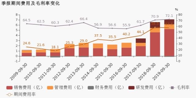 公司2019三季度營業(yè)成本3.4億,同比增長5.1%,低于營業(yè)收入9.9%的增速,導(dǎo)致毛利率上升1.3%。期間費(fèi)用率為57.5%,較去年下降1.0個百分點(diǎn)。
