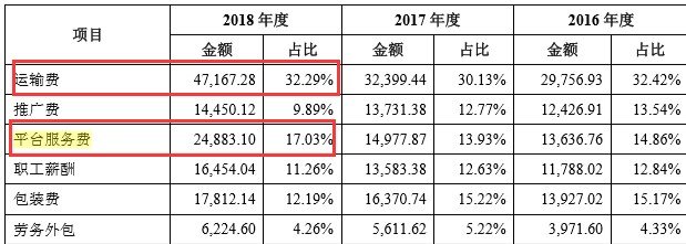 財(cái)報(bào)顯示,2019年上半年,三只松鼠的銷售費(fèi)用上漲47.52%,主要是第三方電商平臺(tái)的服務(wù)費(fèi)用和物流快遞費(fèi)用提升。從招股書(shū)看,銷售費(fèi)用占總費(fèi)用比重較高,銷售費(fèi)用里位居前列的屬運(yùn)費(fèi)和平臺(tái)服務(wù)費(fèi),其中2018年前者為4.72億元,占銷售費(fèi)用比32.29%,后者達(dá)2.49億元,占銷售費(fèi)用比17.03%。