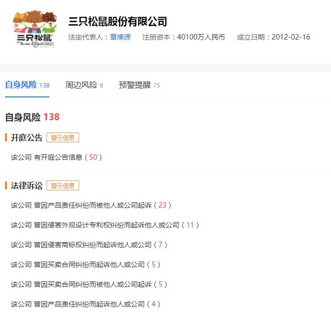 梳理天眼查數(shù)據(jù)看到,三只松鼠自身風(fēng)險(xiǎn)達(dá)138條,周邊風(fēng)險(xiǎn)8條。其中,因產(chǎn)品責(zé)任糾紛案由被起訴提示達(dá)23條;因侵害外觀設(shè)計(jì)專利權(quán)糾紛案由起訴他人或公司達(dá)11條。種種因素下,也為三只松鼠全渠道運(yùn)營(yíng)埋下“隱患”。