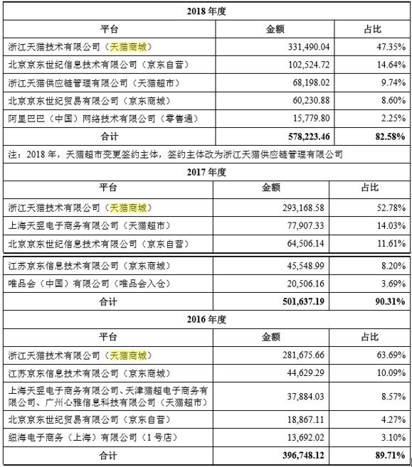 報(bào)告期內(nèi),天貓商城(浙江天貓技術(shù)有限公司)是本公司的主要銷售渠道,其2016年、2017年及2018年?duì)I業(yè)收入的占比分別達(dá)到63.69%、52.78%及47.35%。