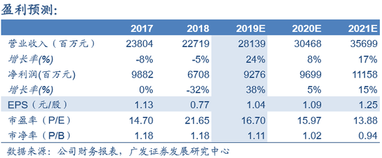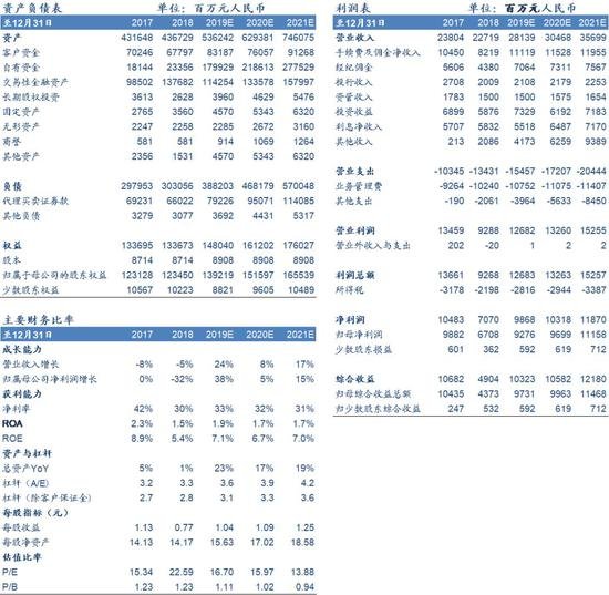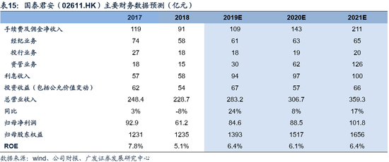 基于以上假設(shè),我們預(yù)計國泰君安2019-2021年分別實(shí)現(xiàn)總收入281.4、304.7、357.0億元,分別同比變動+24%、+8%、+17%,分別實(shí)現(xiàn)歸母凈利潤92.8、97.0、111.6億元,分別同比變動+38%、+5%、+15%;對應(yīng)ROE水平分別為7.1%、6.7%、7.0%。