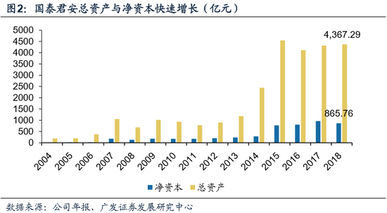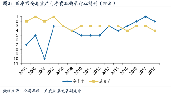 最近十年,國泰君安母公司凈資本擴(kuò)張能力突出,通過增資擴(kuò)股、A-H兩地上市及發(fā)行可轉(zhuǎn)債等,凈資本由2006年末的23億元躍升至2018年末的866億元,行業(yè)排名從第十名上升至第二名, 總資產(chǎn)排名行業(yè)第四名。
