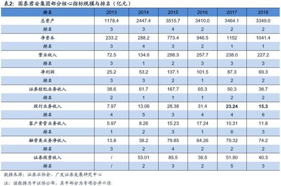 總體來看,國泰君安的特色是各項(xiàng)業(yè)務(wù)均衡發(fā)展,即便鮮有行業(yè)排名第一的業(yè)務(wù),但各項(xiàng)業(yè)務(wù)也基本維系在行業(yè)前五甚至前三的位置,因此綜合起來看實(shí)力強(qiáng)大。根據(jù)年報數(shù)據(jù)披露,2018年國泰君安總資產(chǎn)行業(yè)排名第四、凈資本行業(yè)第二、營業(yè)收入第三、凈利潤第二。當(dāng)然,需要進(jìn)一步確認(rèn)的是,國泰君安在凈資本擴(kuò)張后機(jī)構(gòu)業(yè)務(wù)能力能否同步提升,從最近2年的經(jīng)營表現(xiàn)來看,投行業(yè)務(wù)行業(yè)名次有所下滑。具體業(yè)務(wù)上,國泰君安在經(jīng)紀(jì)業(yè)務(wù)、信用業(yè)務(wù)、機(jī)構(gòu)業(yè)務(wù)、資管業(yè)務(wù)和國際業(yè)務(wù)布局上優(yōu)勢明顯。