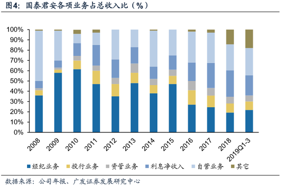 進(jìn)一步分拆為傳統(tǒng)五大業(yè)務(wù)結(jié)構(gòu),從最近10年的收入結(jié)構(gòu)變遷來看,國泰君安與行業(yè)發(fā)展同脈絡(luò),即輕資產(chǎn)業(yè)務(wù)向重資產(chǎn)業(yè)務(wù)過渡,輕資產(chǎn)業(yè)務(wù)收入占比由50%-70%下降至2019Q1-3的不足40%。